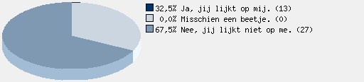 Natuurlijk lijk je niet op me van uiterlijk (en zo wel dan heb ik een dubbelganger) maar (bijna) alle antwoorden die jij aanduidde komen overeen met die van mij. Dus van interesses lijk je wel op mij.